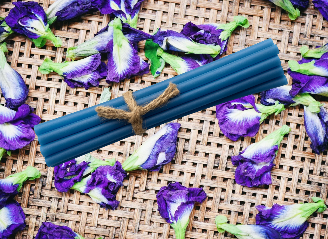 The beautiful blue straws owe their colour to Clitoria Ternatea, commonly known as blue bellvine or Asian pigeonwings, it is a pretty blue flower which is ground into a powder to give the straws its hue. Known for its bright, natural pigment, just 2% is enough to create a striking blue.