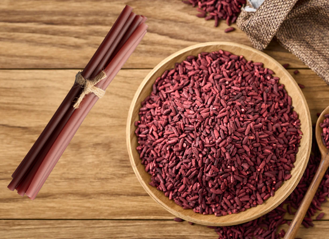 For the warm red tone, the straws use red yeast rice powder. Again, 2% of this natural colourant blends beautifully into the rice-tapioca base, giving it this terracotta shade.